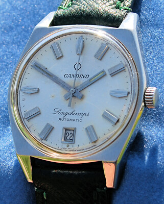 Condizione 1 (ottimo) - Bellissimo e molto raro orologio Candino Longchamps modello Sub 6 ATM, automatico anni '60, perfettamente mantenuto e perfettamente funzionante. Cassa in acciaio di dimensioni 41 x 33,5 mm. escluso la corona, il quadrante piatto con la patina del tempo è ancora molto bello ed affascinante il vetro non ha alcun graffio, fondello a vite marcato con al centro il batiscafo, il movimento è pulitissimo e perfettamente funzionante. Il cinturino verde scuro è nuovo di produzione attuale.Garantisco la massima serietà e veridicità dell’oggetto.