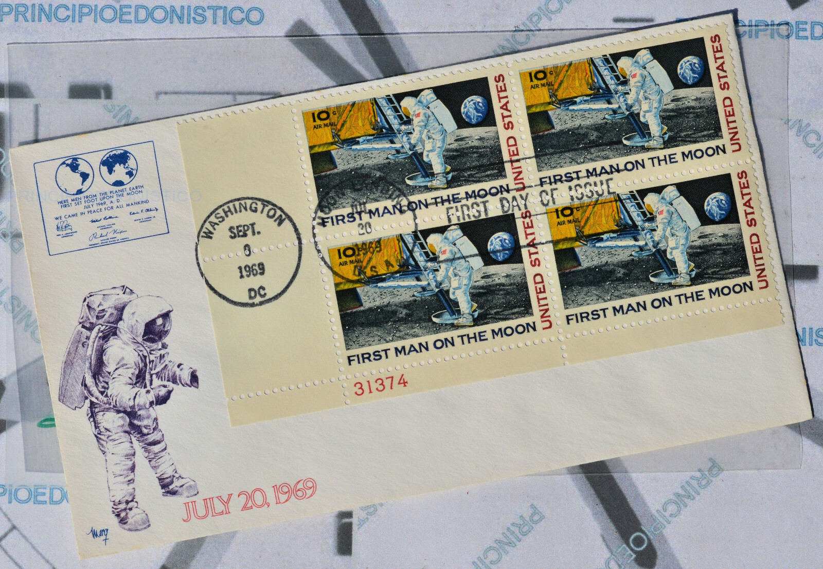 Condizione 1 (ottimo) - Rarissima lettera, HERE MEN FROM THE PLANET EARTH; FIRST SET FOOT UPON THE MOON, JULY 1969. A. D., WE CAME IN PEACE FOR ALL MANKIND, con le firme stampate dei tre astronauti Armstrong Collins Aldrin e del Presidente degli Stati Uniti d'America Richard Nixon, July 20, 1969, FIRST DAY OF ISSUE, datata 20 Luglio 1969, Il primo annullo MOON LANDING è del 20 Luglio 1969, il secondo annullo è WASHINGTON DC del 9 Settembre 1969, i 4 francobolli sono da 10 centesimi di Dollaro USA.
