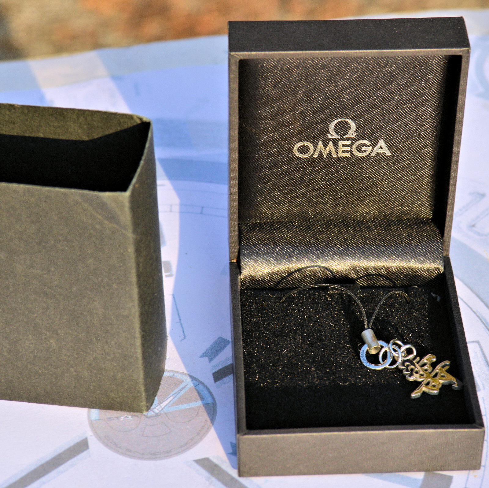 Omega Bellissimo Portachiavi Ideogramma Cinese Originale Nuovo con Scatola